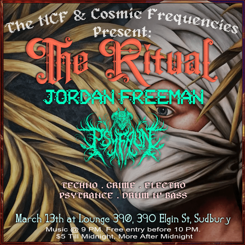 I’m extremely excited to announce the first of what I hope will be many NCF associated events here in Greater Sudbury: “The Ritual” presented by The NCF and Cosmic Frequencies will happen at Lounge 390 at 390 Elgin St. Sudbury on March 13th, 2024.